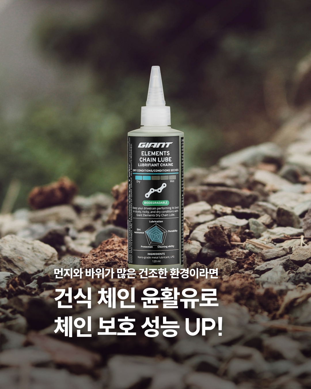 자이언트 엘리먼츠 건식 체인 윤활유로 먼지와 바위가 많은 건조한 환경에서도 구동계의 퍼포먼스를 최상으로 유지하세요. 체인 링크 위로 2~3cm 마다 한 방울씩 떨어뜨려 직접 도포하세요. 부드러운 극세사천으로 남는 윤활유를 닦아내세요.