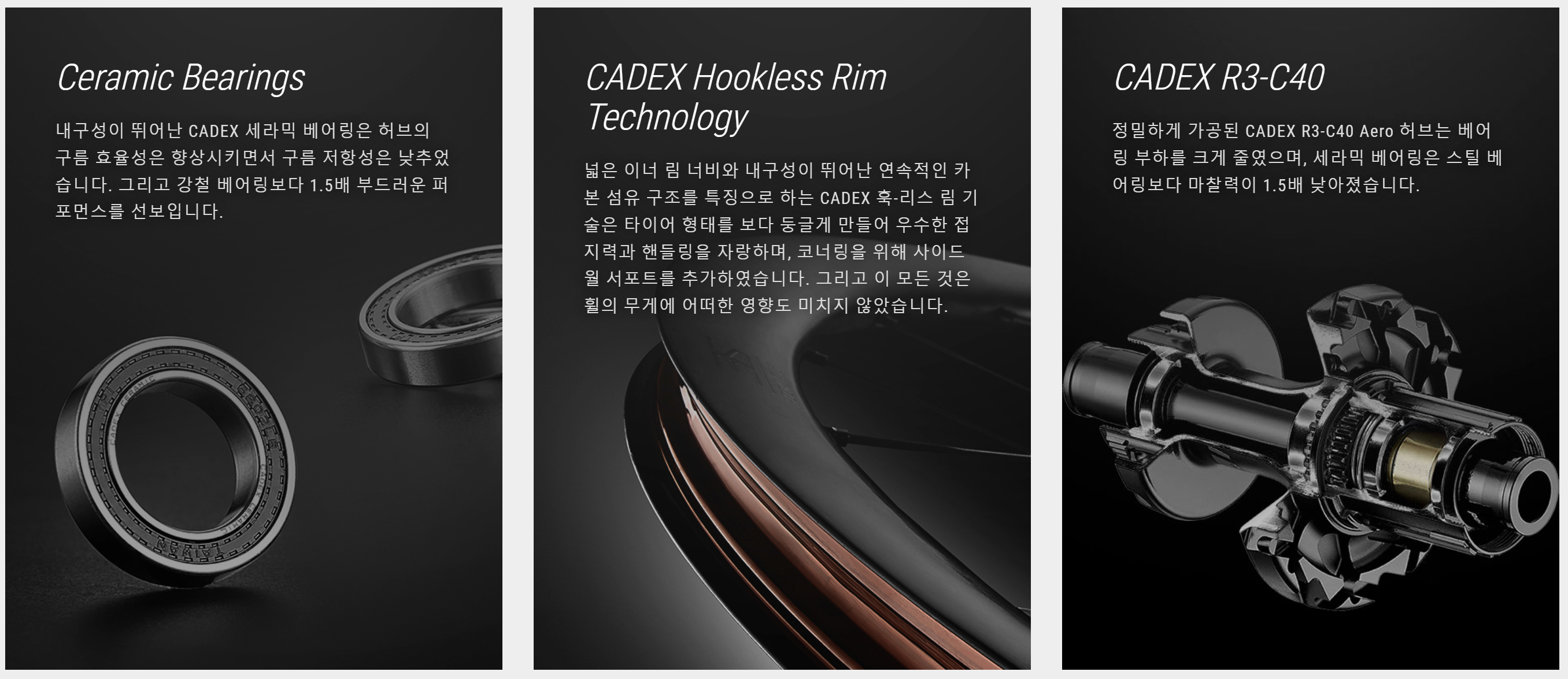 림 소재 초경량 18K 풀 카본 복합소재 림 높이 50mm (프론트) 림 외부 너비 30mm (프론트) 림 내부 너비 22.4mm 허브 CADEX R3-C40 허브, 센터락 (프론트), CADEX R3-C40 허브, 40T 라쳇 드라이버, 센터락 | 베어링 100x12 Thru Axle (프론트) 액슬 880g (프론트) 무게(밸브 제외) 880g (프론트), 1047g (리어) 워런티 2년 |
