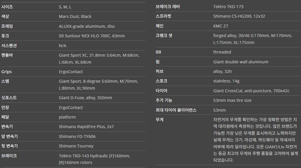 Agility and control 업데이트된 플랫바 프레임 지오메트리는 라이더에게 효율성과 안정성의 균형을 맞추는 자세를 제공하며, 디스크 브레이크는 거친 노면이나 비포장도로에서 추가적인 제어력을 제공합니다. | Smooth-riding comfort D-Fuse 싯포스트와 서스펜션 포크는 노면의 충격과 진동을 흡수하며, EasyRide 튜브리스 타이어는 낮은 공기압으로 주행하여 펑크의 위험을 줄이고 부드러운 승차감을 제공합니다. | Integrated rack mounts 리어 랙과 호환되어 일상 여행이나 장거리 여행에 필요한 화물을 쉽게 실을 수 있습니다. |